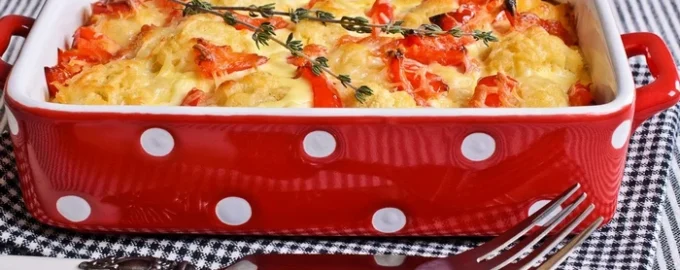 Podstawą zapiekanki są warzywa, które sprawią, że mięso kurczaka będzie soczyste, a dzięki nadzieniu z jajek i śmietany zapiekanka okaże się delikatna.